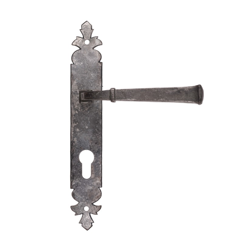 Ensemble de 2 béquilles carrées en fer forgé d'inspiration 18ème sur 2 plaques 245 x 36 mm avec entrée de cylindre 70mm. La béquille mesure 140 mm hors tout le carré plein en fer de 16mm est entièrement travaillé à la forge.