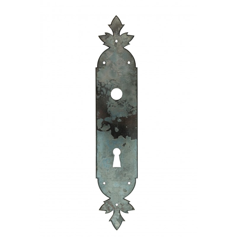 Plaque découpée en fer forgé martelée avec trou de béquille et cylindre ou clé. Dimensions 260 x 51 mm ép. acier 2mm. . Inspiration XVIIème